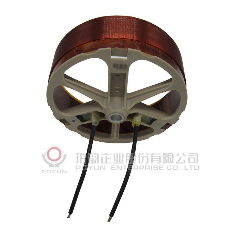 扁綫音圈粘合支架,一層立繞,引綫用銅片引出后再接加黑色絕緣套管的錦絲綫。